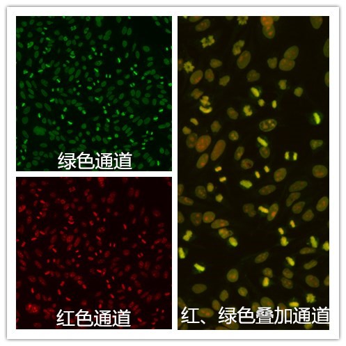 EUROPattern拍出的圖片,共有三種。綠色通道,即與熒光顯微鏡拍出的圖片相同。紅色通道,細(xì)胞核經(jīng)過碘化丙啶紅色復(fù)染,通過紅色通道獲取信息,不僅可以幫助尋找和識(shí)別細(xì)胞核和分裂期細(xì)胞,還可以避免可能出現(xiàn)的假陰性結(jié)果。紅綠疊加通道,可以清晰的觀察區(qū)分細(xì)胞核與細(xì)胞胞漿信息。