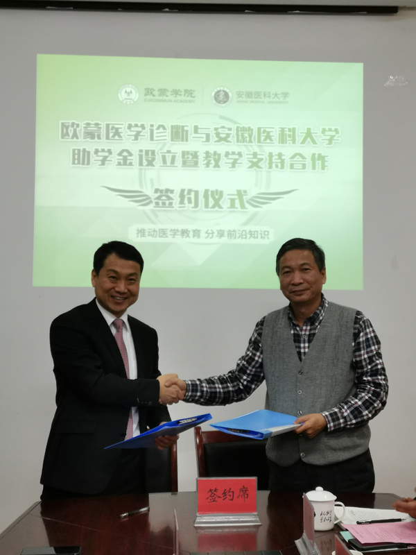 簽約儀式上,李川總裁與基金會秘書長許柏松簽訂助學(xué)金協(xié)議,與檢驗系主任徐元宏簽訂教學(xué)合作協(xié)議。期間安徽醫(yī)科大學(xué)代表楊秀蘭書記對歐蒙一行成員的到來表示熱烈歡迎,并介紹了學(xué)校的發(fā)展歷史、基本情況和近年來取得的重大成果,表示希望能夠與歐蒙開展全方位、高起點(diǎn)合作,以學(xué)生為中心,企業(yè)參與人才培養(yǎng)全過程,共同打造校企合作典范。