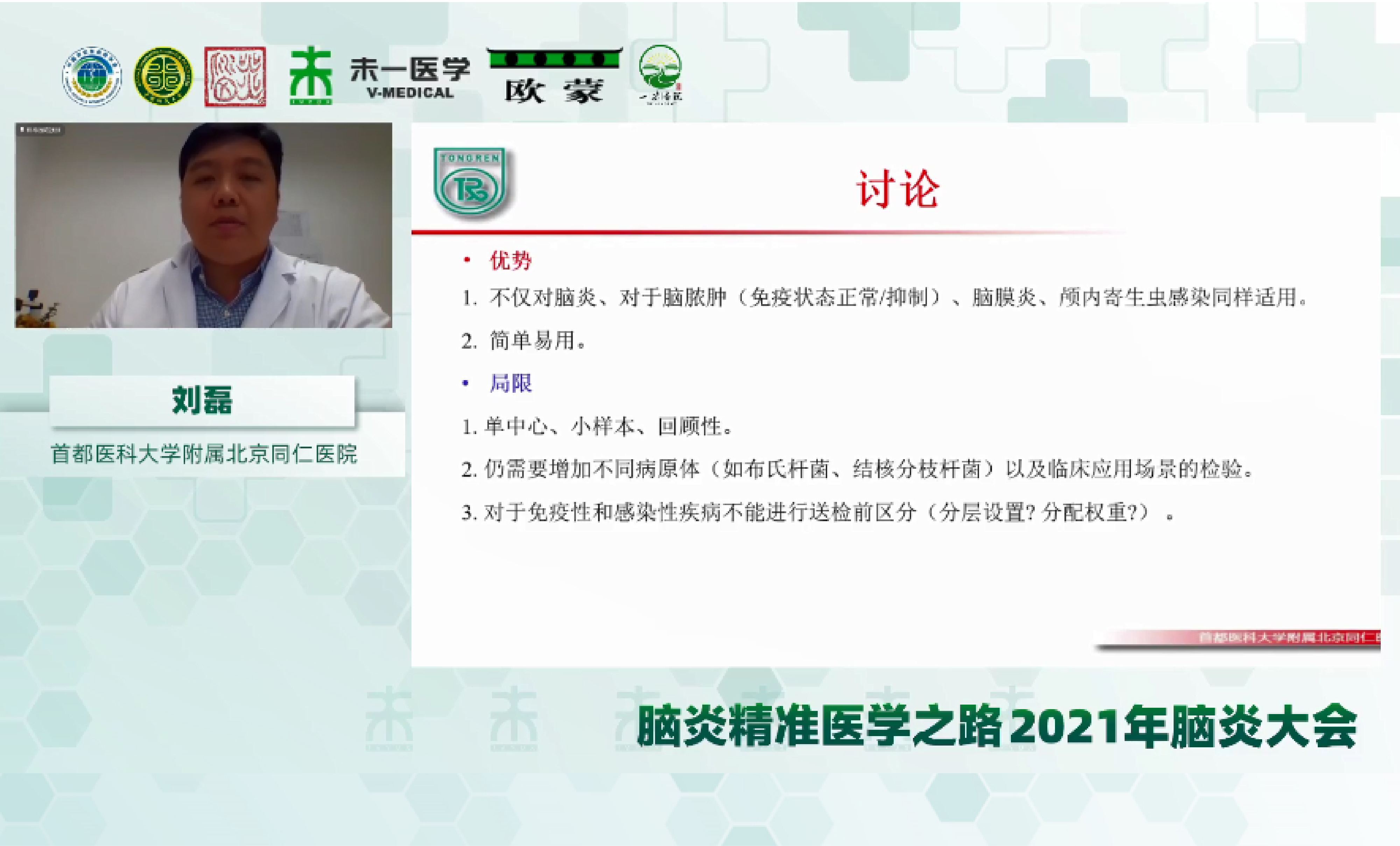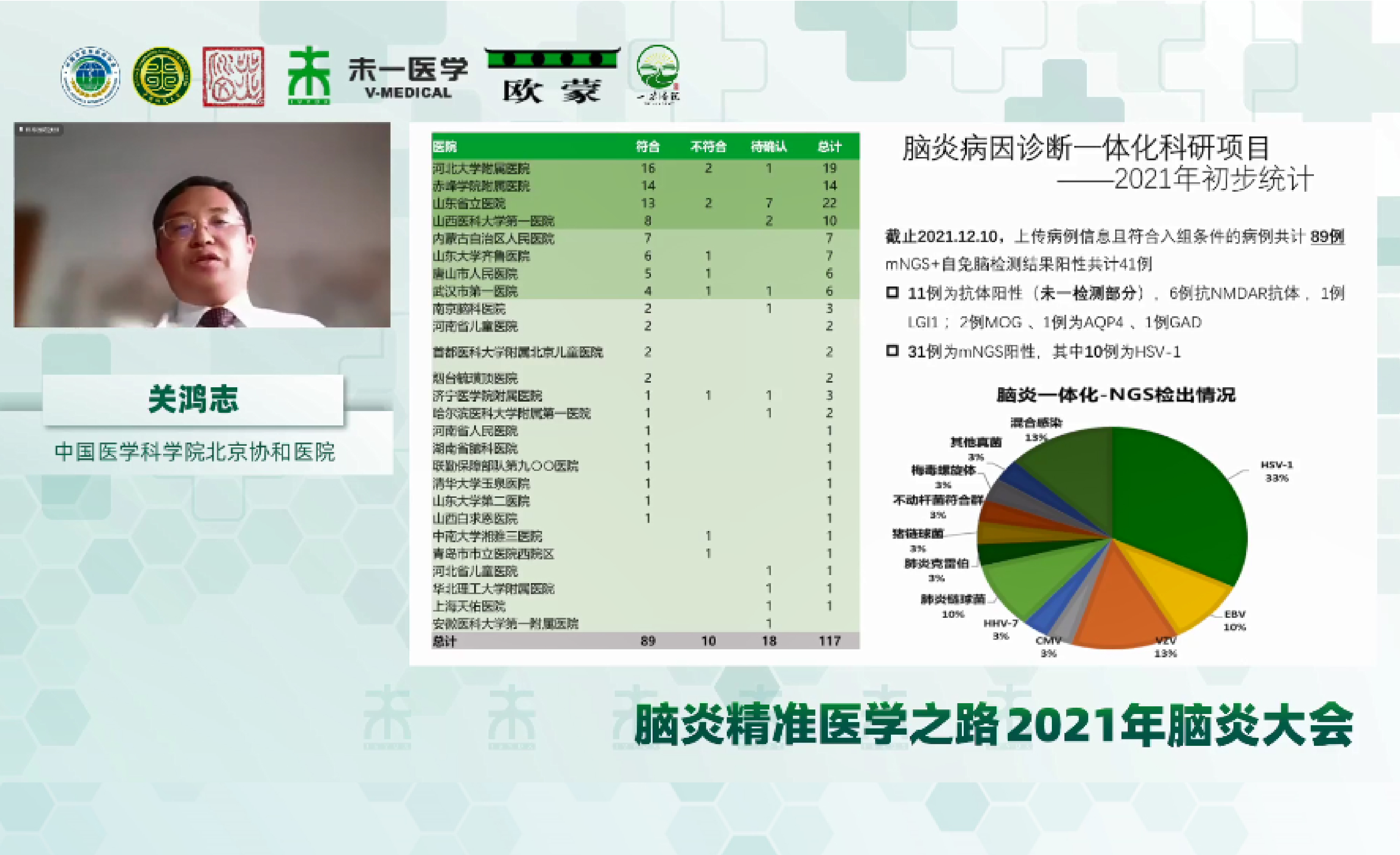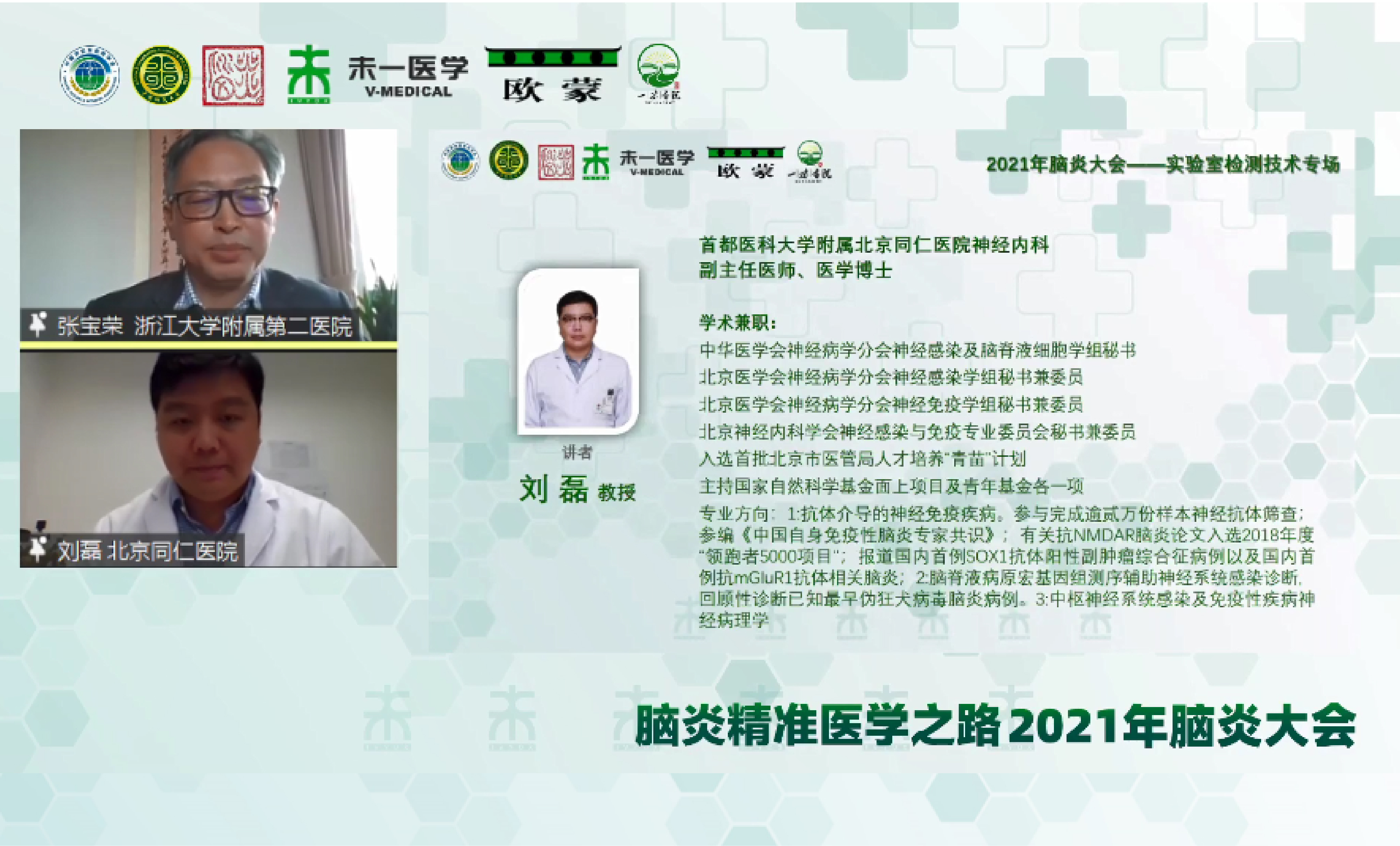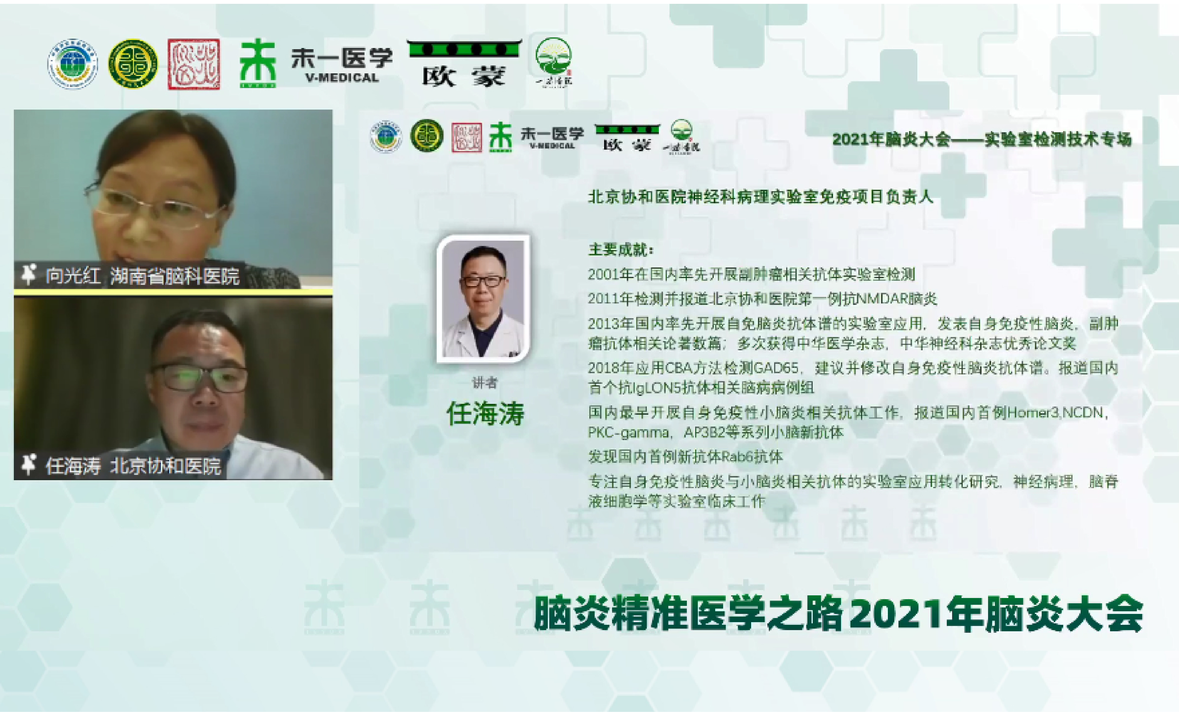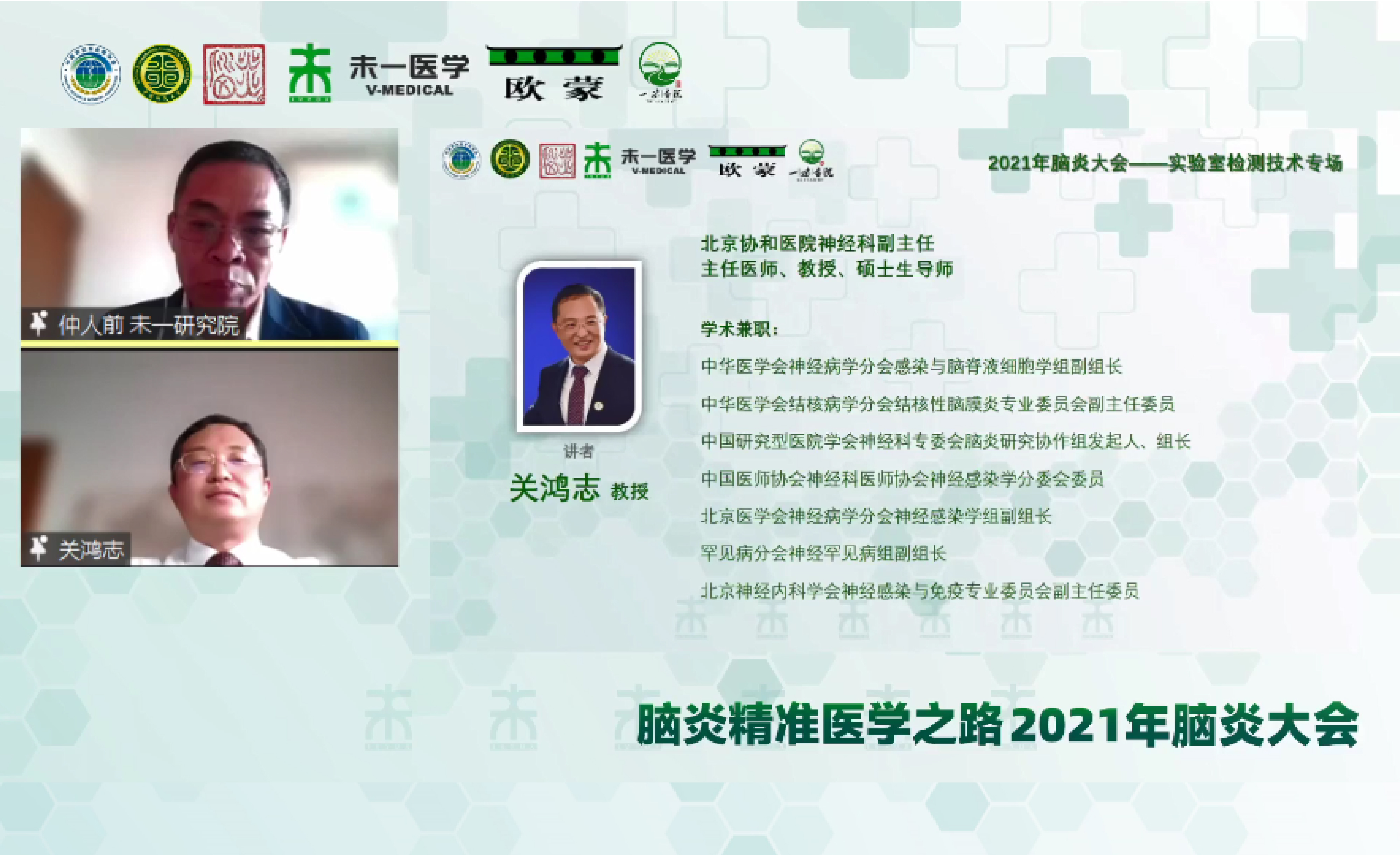 2021年4月23日北京協(xié)和醫(yī)院關(guān)鴻志教授團(tuán)隊(duì)與未一醫(yī)學(xué)共同發(fā)起了全國多中心腦炎病因診斷一體化方案研究項(xiàng)目,目前已有近30家醫(yī)院參與。未一醫(yī)學(xué)作為唯一一家第三方實(shí)驗(yàn)室,為該項(xiàng)目提供樣本檢測以及樣本管理等支持。本次會議上關(guān)鴻志教授回顧近半年腦炎病因診斷一體化方案研究進(jìn)展。對于原因未明的腦炎,通過腦炎一體化項(xiàng)目檢測,協(xié)和醫(yī)院實(shí)驗(yàn)室近兩年發(fā)現(xiàn)了18種抗體,其中與中科院王晶教授團(tuán)隊(duì),應(yīng)用TBA方法,發(fā)現(xiàn)了新型抗小腦浦肯野細(xì)胞抗體-抗Rab6抗體。對于符合入組標(biāo)準(zhǔn)的患者,項(xiàng)目組可以提供免費(fèi)的腦脊液細(xì)胞學(xué)、二代測序宏基因組檢測,同時北京協(xié)和醫(yī)院關(guān)教授團(tuán)隊(duì)可提供遠(yuǎn)程線上會診。最后,關(guān)教授邀請線上的醫(yī)學(xué)同仁共同參與到腦炎一體化項(xiàng)目,齊力推動腦炎病因精準(zhǔn)診斷前行。未一研究院仲人前教授作為本環(huán)節(jié)的主持嘉賓,結(jié)合報(bào)告的內(nèi)容進(jìn)行精彩總結(jié)。
