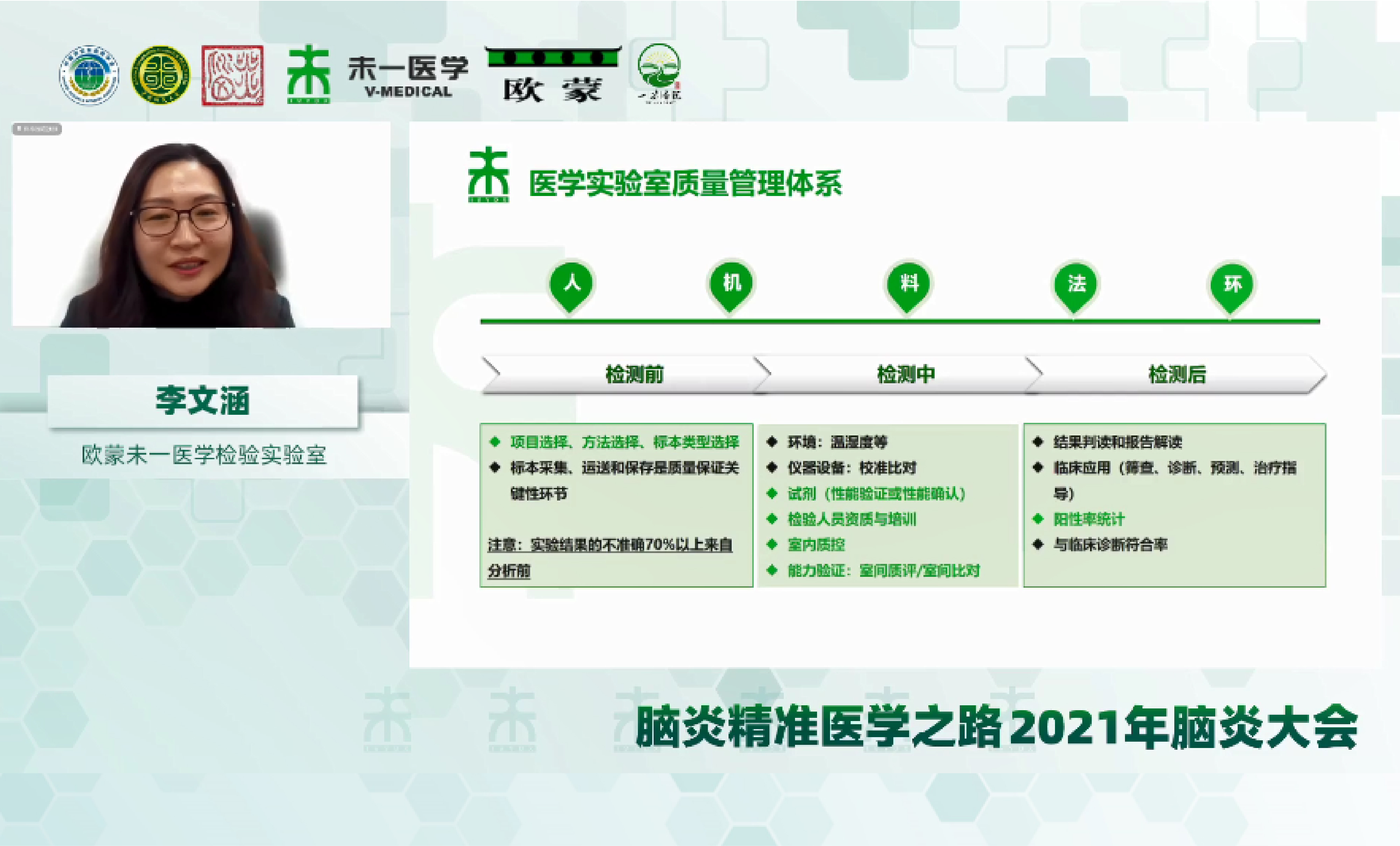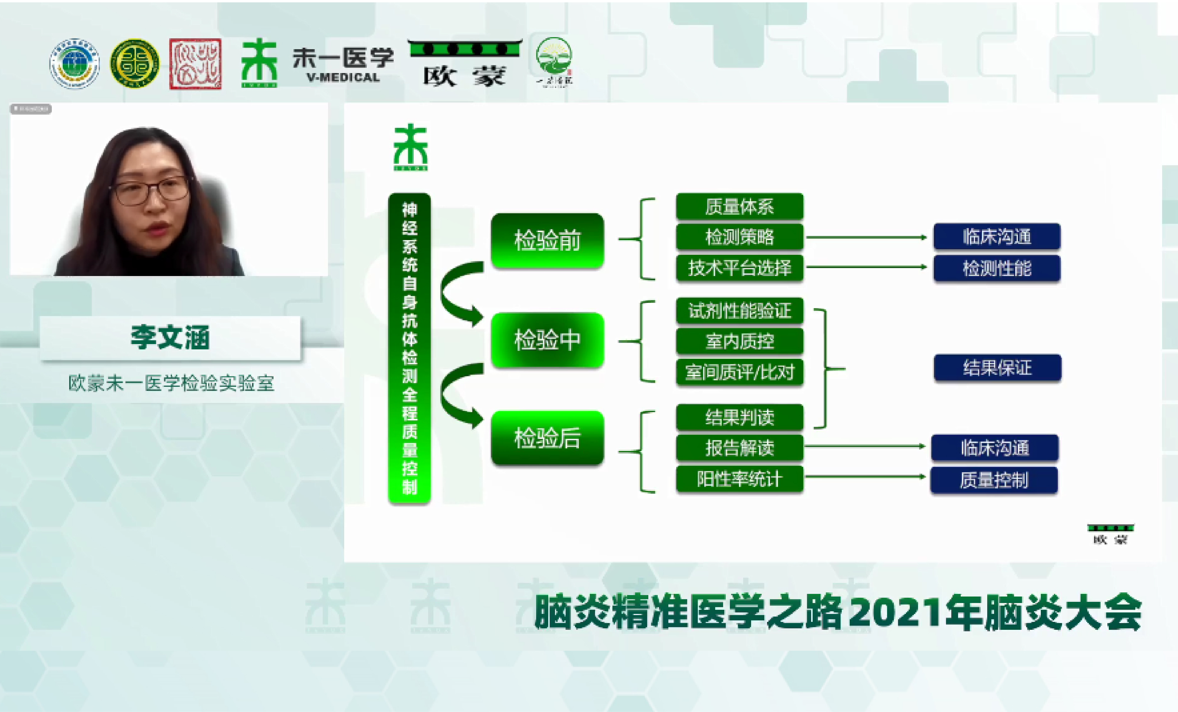 作為國內(nèi)專注于自身抗體檢測的第三方檢驗(yàn)實(shí)驗(yàn)室,未一醫(yī)學(xué)李文涵博士從檢驗(yàn)全程質(zhì)量控制出發(fā),匯報(bào)了實(shí)驗(yàn)室在檢驗(yàn)前、檢驗(yàn)中、檢驗(yàn)后所做的工作。檢驗(yàn)前在方法學(xué)選擇方面,未一醫(yī)學(xué)自2014年開始一直堅(jiān)持神經(jīng)自身免疫抗體CBA和TBA聯(lián)合檢測,已成為實(shí)驗(yàn)室常規(guī)檢測策略,可提供更多信息,結(jié)果更精準(zhǔn)。在檢驗(yàn)中實(shí)驗(yàn)室依據(jù)CNAS認(rèn)證對試劑進(jìn)行性能驗(yàn)證,同時在IFA判讀方面建立了完善的培訓(xùn)體系,判讀人員具有專家級能力;未一醫(yī)學(xué)實(shí)驗(yàn)室已連續(xù)多年滿分通過歐蒙全球神經(jīng)自身抗體室間質(zhì)評。在檢驗(yàn)后有專業(yè)的醫(yī)生對報(bào)告進(jìn)行解讀,定期進(jìn)行檢測結(jié)果統(tǒng)計(jì)分析,未一醫(yī)學(xué)實(shí)驗(yàn)室與北京協(xié)和醫(yī)院神經(jīng)科實(shí)驗(yàn)室結(jié)果互認(rèn),在腦炎抗體陽性率和陽性抗體占比情況高度一致。通過2021年數(shù)據(jù)分析發(fā)現(xiàn),自身免疫性腦炎血清與腦脊液配對送檢陽性率明顯高于單樣本類型送檢,建議臨床首次送檢時血清和腦脊液平行檢測保證結(jié)果的準(zhǔn)確性。中國醫(yī)科大學(xué)附屬盛京醫(yī)院馮娟教授作為本環(huán)節(jié)的主持嘉賓,結(jié)合報(bào)告的內(nèi)容進(jìn)行精彩總結(jié)。