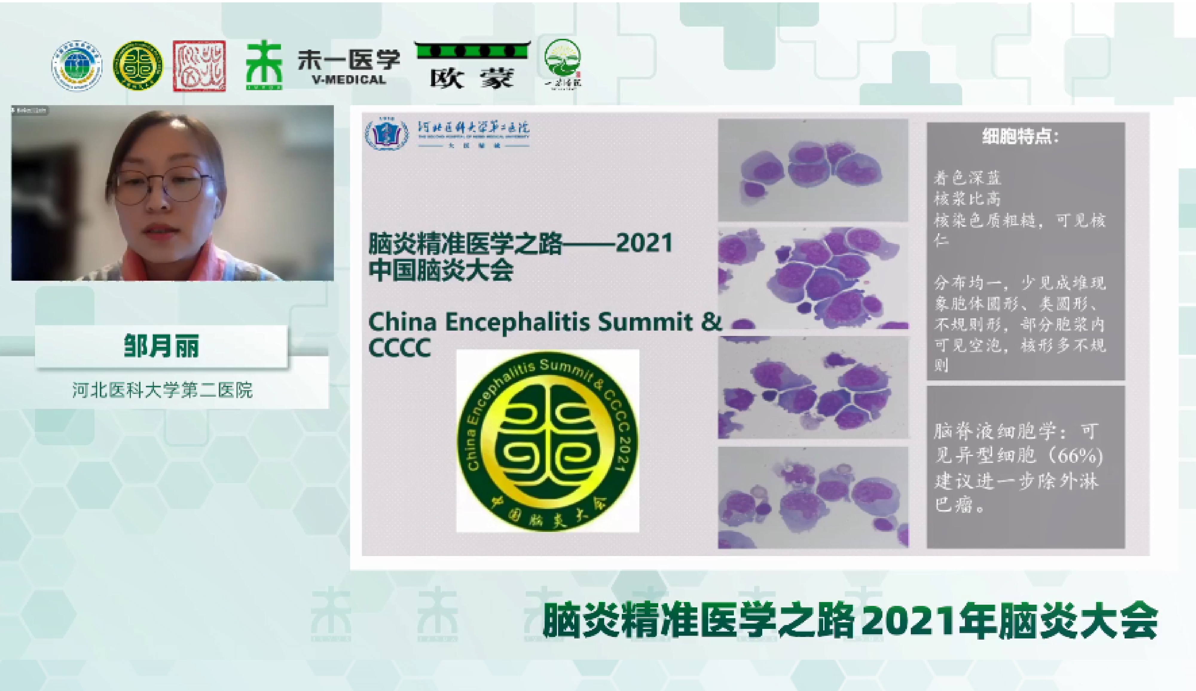 病例分享環(huán)節(jié),河北大學(xué)附屬醫(yī)院邸衛(wèi)英教授分享通過腦脊液二代測序檢測確診VZV腦炎的病例;河北醫(yī)科大學(xué)第二醫(yī)院鄒月麗教授通過腦脊液細(xì)胞學(xué)檢測發(fā)現(xiàn)異型細(xì)胞,最終確診為原發(fā)性中樞神經(jīng)系統(tǒng)彌漫大B細(xì)胞淋巴瘤;赤峰學(xué)院附屬醫(yī)院喬小東醫(yī)生分享病例的患者腦脊液細(xì)胞學(xué)檢測可見腫瘤細(xì)胞,最終確認(rèn)為腦膜癌病。武漢大學(xué)中南醫(yī)院徐艷教授、南方醫(yī)科大學(xué)南方醫(yī)院胡亞芳教授、赤峰學(xué)院附屬醫(yī)院趙偉麗教授作為病例分享環(huán)節(jié)的主持嘉賓。