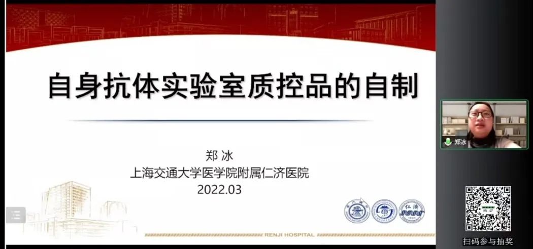 隨后,由鄭冰教授跟我們分享《自身抗體實驗室質控品的自制》。首先,鄭冰教授指出質控品是檢驗科實驗室保證檢測質量的重要環節和手段。自制質控品可用于室內質量控制,其聯合商品化質控品可滿足臨床實驗室室內質量控制要求,避免和彌補全部使用商品化質控品成本高、質控項目不全面等缺點,實現檢驗科節約成本和提高檢驗質量的要求。接著介紹了自制質控品可參照ISO指南80、體系文件CNAS-GL005,并列舉了兩個指南中自制質控品的流程及方案。最后,鄭教授用實際案例講述了質控品的評估和使用,希望通過今天的介紹可以讓老師了解質控品的自制并應用在自己科室。