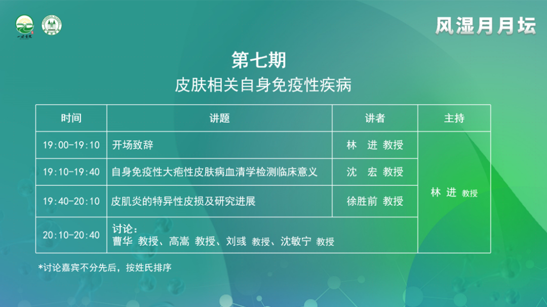林進教授首先表示非常高興與各位同道、各位專家線上相見,參與到一味書院舉辦的第七期風濕月月壇中,非常榮幸能夠以線上的形式與大家相聚,一同暢談皮膚相關自身免疫性疾病的臨床意義及探索。近年來,我們對自身免疫病性疾病的關注程度不斷提高,診療技術日新月異,皮膚相關自身免疫病性疾病取得研究成果比較顯著;但部分診斷和治療方案具有個體化差異,隨著對疾病發(fā)病機制的深入研究,還需要進一步實現(xiàn)精準診斷與治療。