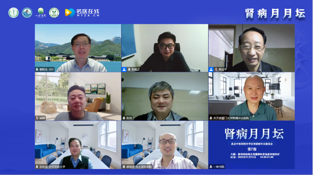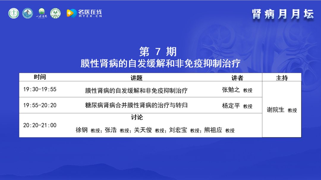 疫情可能影響大家相聚,但卻阻止不了學術交流,“腎病月月壇”第七期如期而至。謝教授代表北京中西醫結合學會腎臟病專業委員會對各位專家、各位同仁及各位朋友出席本期“腎病月月壇”表示熱烈的歡迎和衷心的感謝。謝教授介紹,“腎病月月壇”簡單五個字卻蘊含著三層寓意:首先,“腎病”是指咱們論壇聚焦腎病和腎臟相關疾病的診斷、治療和預防,臨床、科研和教學。因為現在腎臟病很常見,腎臟病的診療手段日升月異。比如膜性腎病,血中抗體的無創診斷,單克隆抗體的合理使用等,不學習就會落伍。其次,是“月月”,本論壇每個月舉辦一次,時間固定在每個月第三周的星期二晚上19:30-21:30,以便于參會者能夠提前安排好時間準時參加線上直播,同時,為了滿足時間確實沖突無法參加線上直播又迫切想學習的同行而提供了回放功能;最后是“壇”,“壇”也有三層意思,一是學術論壇,在這里只要是學術相關的內容,什么都可以說。二是談話、交談,大家可以在這里平等地交談。三是平臺,學術交流的平臺、思想交流的平臺,情感交流的平臺,我們很多老朋友很久沒有見面了,通過腎病月月壇,可以每個月在云端見面一次。謝教授介紹道,“腎病月月壇”自今年5月17日開壇以來,每期一個主題,已經舉辦了六期,包括“激素和免疫抑制劑在膜性腎病的合理應用”、“利妥昔單抗在膜性腎病的合理應用”、“原發性和繼發性膜性腎病的鑒別”及“中醫對膜性腎病的認識”、“膜性腎病的抗原分類及發病機制”以及“膜性腎病的臨床表現、無創診斷和病理診斷”。本期論壇的主題是“膜性腎病的自發緩解和非免疫抑制治療”。邀請的講者和點評、討論嘉賓都是業內非常著名的臨床專家、研究生導師、業務院長、大內科主任、腎內科主任,具有豐富的臨床、教學和科研經驗,相信他們的分享一定會對大家的臨床診療有所幫助。