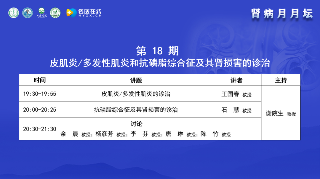 謝教授介紹腎病月月壇自2022年5月線上舉辦后受到全國同仁的支持和歡迎。學術活動開始主要聚焦于腎臟疾病,以膜性腎病為主,后逐漸擴展到新冠相關性多學科論壇及風濕病相關腎損害。在論壇內容上,以臨床需求和臨床問題為導向,體現中醫和西醫的結合、腎科和其他學科的結合;在形式上,體現以講座、病例分享和點評討論相結合。本期討論和學術交流的主要內容是皮肌炎、多發性肌炎和抗磷脂綜合征及其腎損害。皮肌炎、多發性肌炎和抗磷脂綜合征腎損害在臨床上常見,影響著患者的生活質量和生命質量。論壇內容同樣包括講座和點評討論,針對皮肌炎、多發性肌炎和抗磷脂綜合征及其腎損害的問題展開交流和討論。本期邀請的講者和點評、討論嘉賓都是風濕科和腎內科非常著名的專家,具有豐富的臨床、教學和科研經驗。