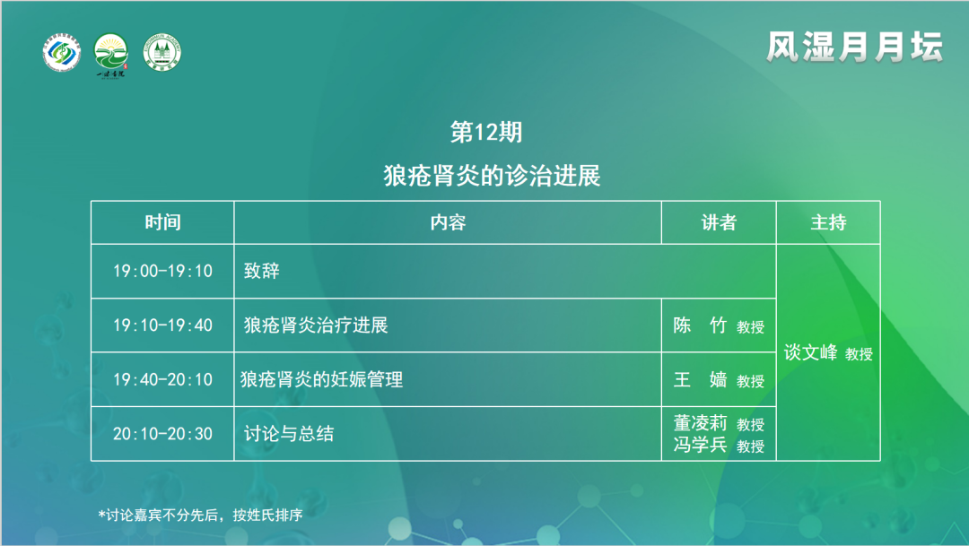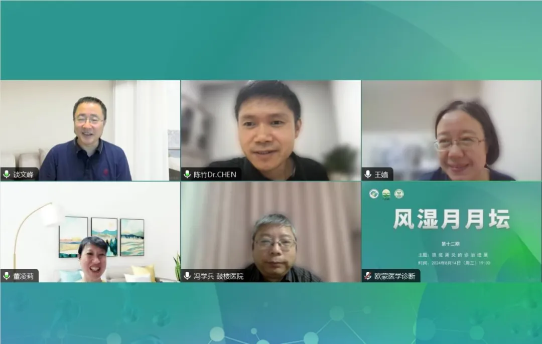 2024年8月14日(周三),由江蘇省研究型醫(yī)院學(xué)會(huì)和一味書(shū)院主辦的《風(fēng)濕月月壇(第12期)—狼瘡腎炎的診治進(jìn)展》于線上成功舉辦。本次論壇由江蘇省人民醫(yī)院談文峰教授擔(dān)任大會(huì)主席,安徽省立醫(yī)院陳竹教授、江蘇省人民醫(yī)院王嬙教授作為講課嘉賓,華中科技大學(xué)同濟(jì)醫(yī)學(xué)院附屬同濟(jì)醫(yī)院董凌莉教授、南京大學(xué)醫(yī)學(xué)院附屬鼓樓醫(yī)院馮學(xué)兵教授作為本次會(huì)議的討論嘉賓。