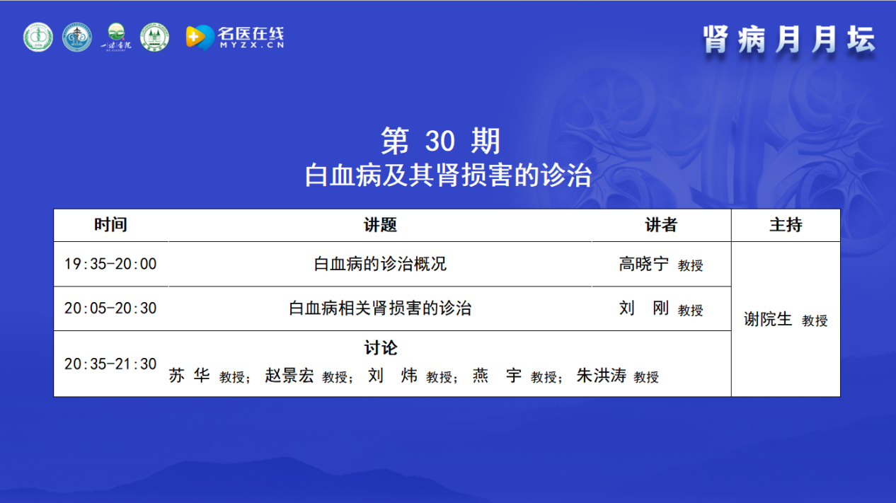 今天的主題是白血病及其腎損害的診治,很榮幸邀請到了在該領域有很深造詣的專家,包括血液病專家、腎臟病專家、成人內科專家、兒科專家、臨床專家和病理專家,都是一線非常有經驗的專家,一起進行學術講座、點評與討論。