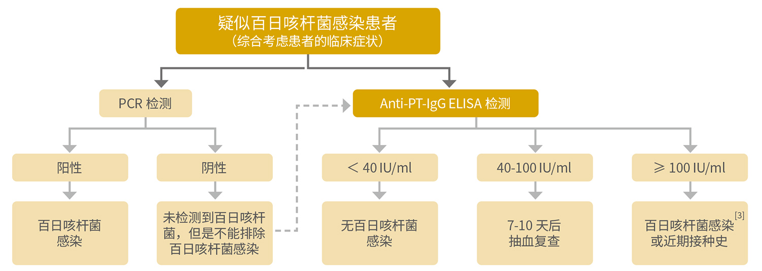 全球百日咳計劃(Global Pertussis Initiative,GPI)建議及《中國兒童百日咳診斷及治療建議》均按照不同的年齡段給出推薦的百日咳臨床診斷標準和實驗室檢測方法。其中《中國兒童百日咳診斷及治療建議》增加了在兒童各個年齡段,均可通過發病初期與恢復期雙份血清PT-IgG滴度出現顯著升高(>2~4倍)進行診斷。